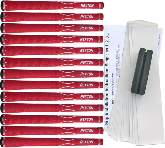 Multiple surface patterns with different lines are strategically located at front and backside to ensure a secure grip.The upper portion is more textured, featuring vertical lines and V-line grooves for traction and all-weather control. The lower portion is smooth surface with subtle grooves for comfort and responsiveness. Made from high-grade rubber compounds. Frequent re-gripping is proven to save you 3-4 strokes per round. Re-gripping is as Easy as 1 – 2 – 3. This self-contained Grip Kit includes the following supplies: 13 x Rexton grips; 13 x Solvent activated double extended grip tape strips, 2″ wide; 1 x Quality rubber vise clamp; 1 x Easy to follow instructions. Grip solvent not included. Paint thinner available at hardware stores.