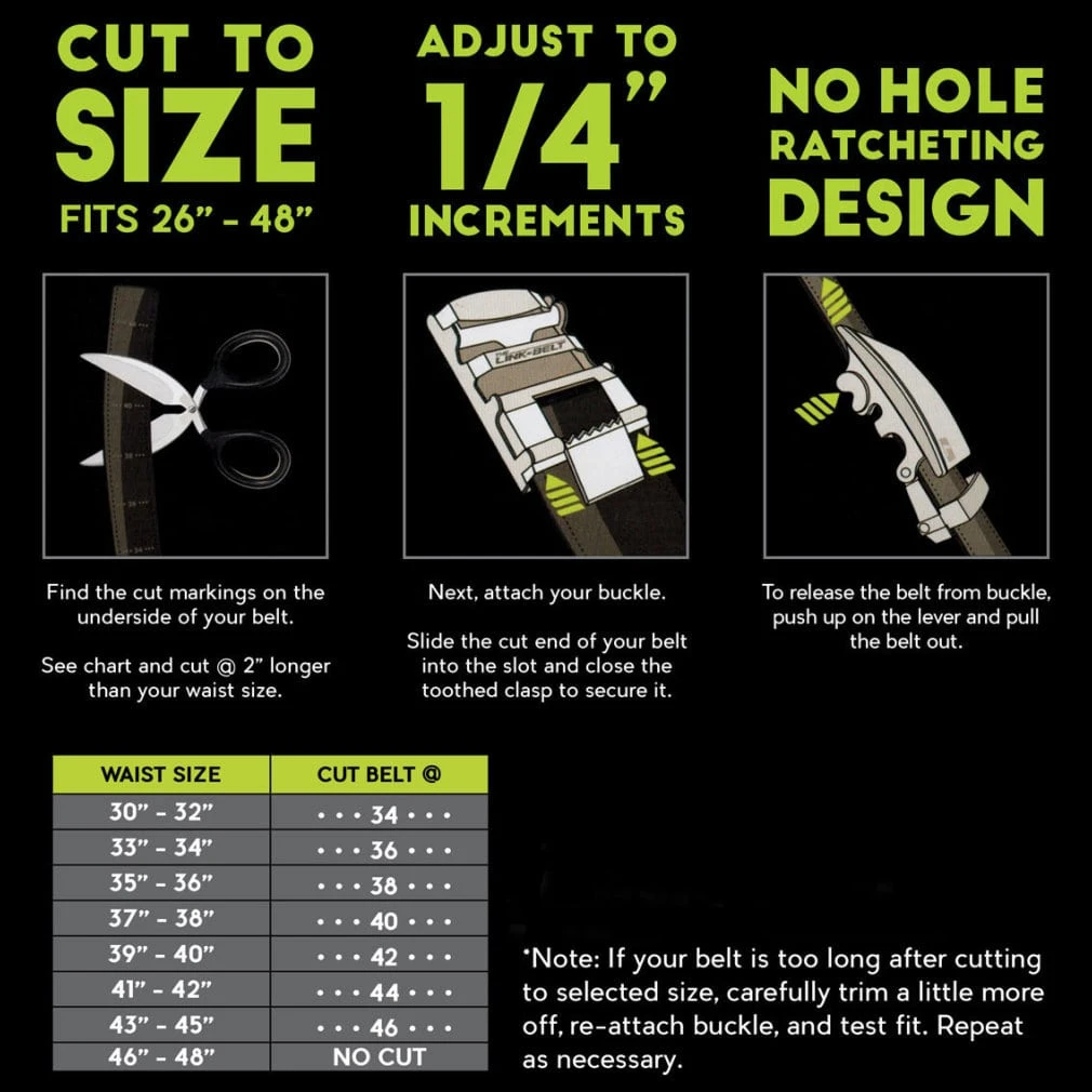 - When you need a custom fit, look toward a ratcheting belt. Regular belts use 1” holes, which can leave you too tight or too loose. This features a unique ratcheting belt buckle (no holes!), which adjusts to 1/4” increments for the most comfortable fit in the world.